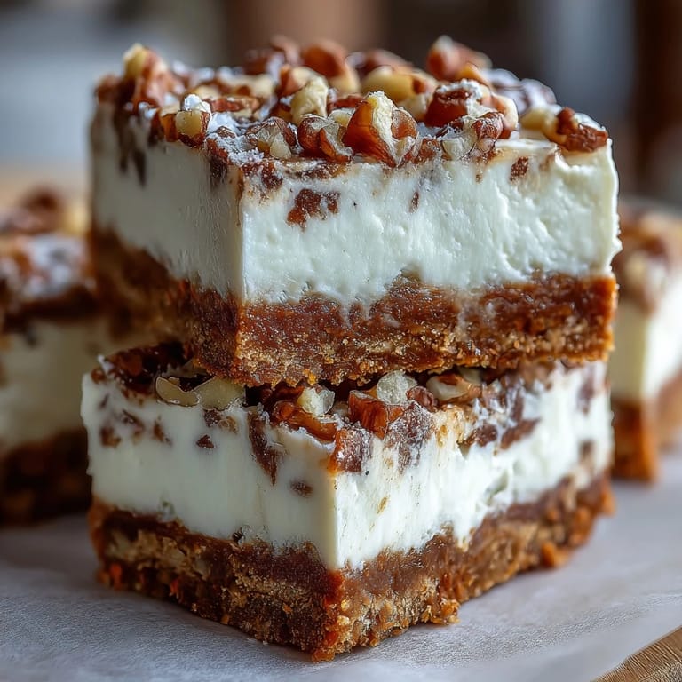 Save to Pinterest The first time I made carrot cake cheesecake bars, my kitchen was filled with the scent of warming spices and tangy cream cheese—and I nearly burned my thumb impatiently checking for doneness. There was something playful about layering two classics, and swirling them together felt a little like mixing up springtime in a pan. I couldn't help but smile as the cinnamon and nutmeg drifted through the air, turning ordinary afternoon prep into a small celebration. Watching the batter settle and the cheesecake shine on top made me anticipate sharing these bars before they'd even cooled. Sometimes, it's the moments spent in anticipation, rather than the act of baking itself, that make a recipe stand out.