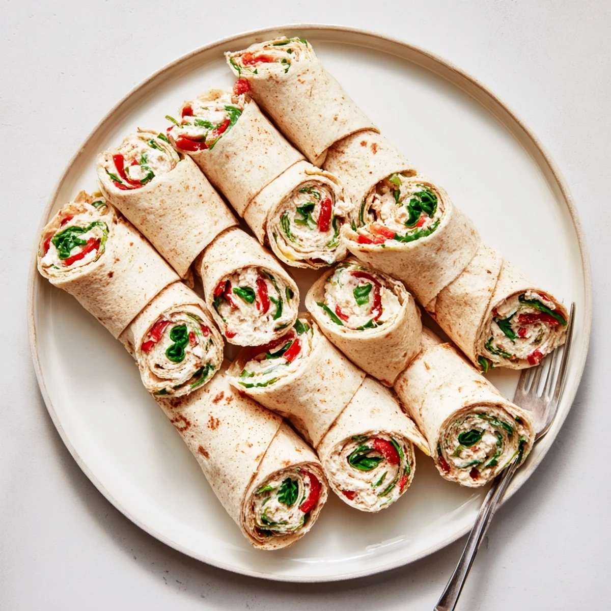 Save to Pinterest Festive and colorful tortilla roll-ups filled with cream cheese, roasted peppers, and spinach—perfect for holiday parties and gatherings.