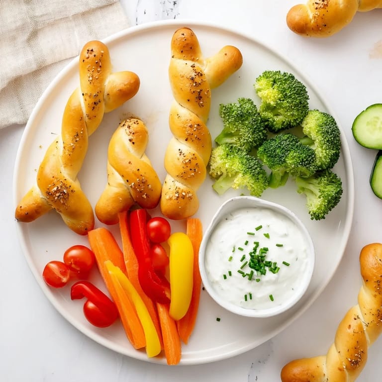 Save to Pinterest A playful, kid-friendly platter featuring dinosaur bone breadsticks and a colorful assortment of crunchy raw vegetables, perfect for parties or themed gatherings.