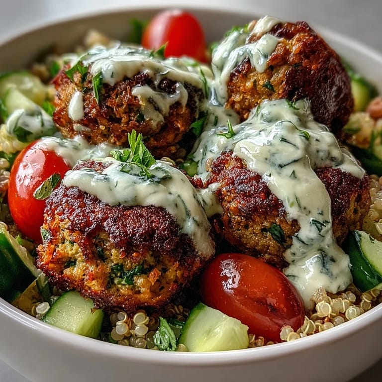 Save to Pinterest There's something magical about a bowl that tastes like it took hours but comes together in under an hour. I discovered this falafel quinoa salad on a Tuesday afternoon when my roommate challenged me to make something satisfying that wasn't just another grain bowl. The moment I bit into a warm, crispy falafel perched on fluffy quinoa with that creamy tahini drizzle, I understood why this dish has become my go-to answer when someone asks what I'm making for dinner.