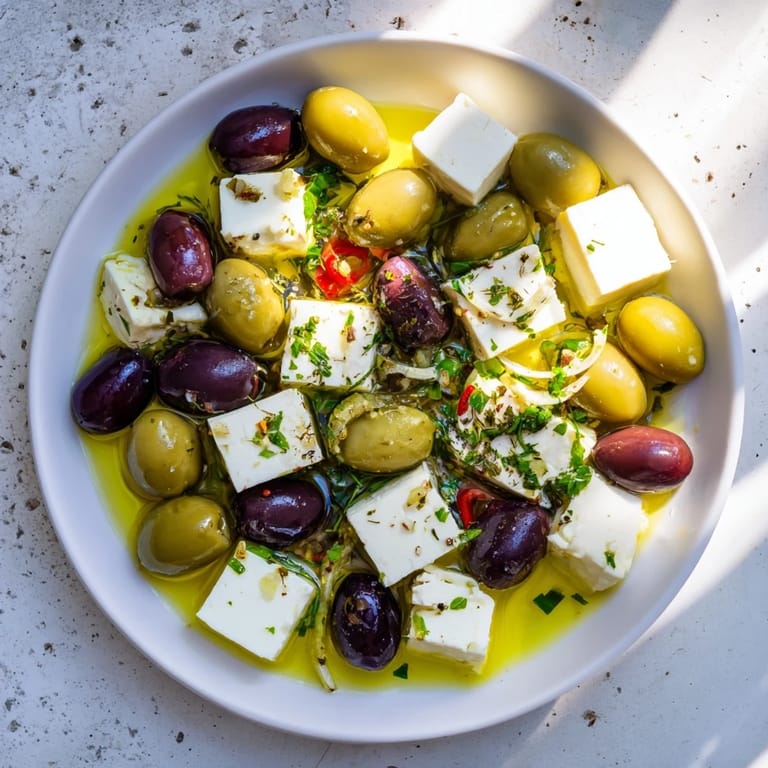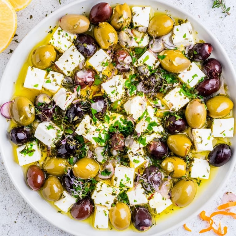 Save to Pinterest A vibrant and festive appetizer featuring a medley of marinated olives and creamy feta cubes, perfect for entertaining and holiday gatherings.
