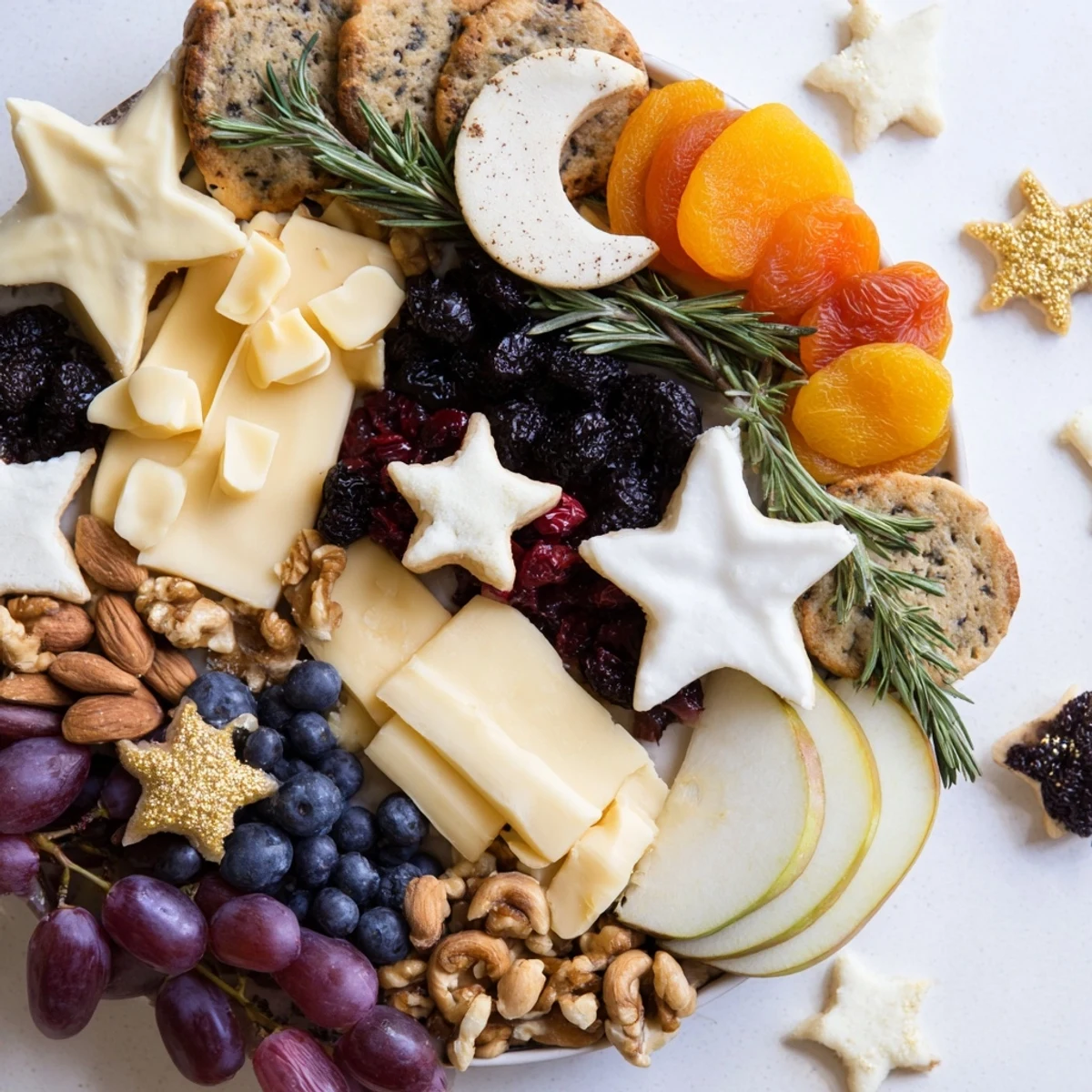 Use small star and crescent moon cookie cutters to cut cheeses like brie and gouda into charming celestial shapes.