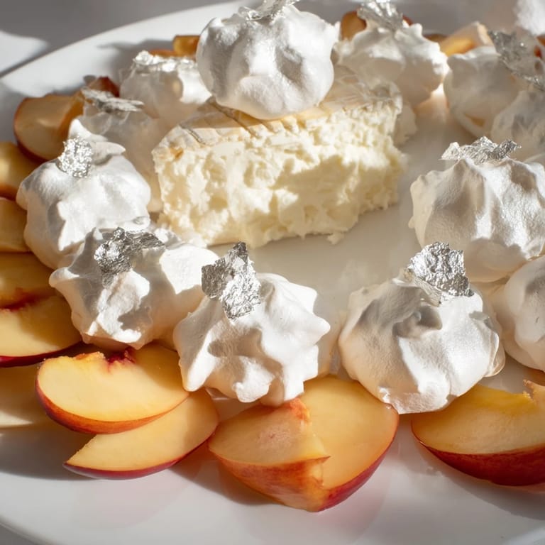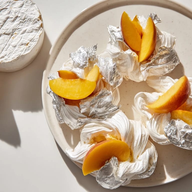 This is the kind of dish that rewards a little theater in the serving. Assemble it just before people arrive so everything is at perfect temperature and the silver leaf hasn't started to dull. Explain what it is if you want, but honestly, let people discover the combination themselves—there's something delightful about watching someone try brie with meringue and peach for the first time.