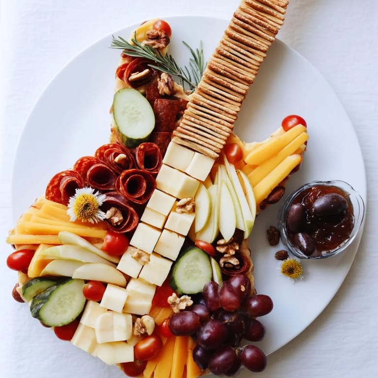 Save to Pinterest A bold, show-stopping party platter inspired by rock concerts, featuring a medley of crowd-pleasing snacks, cheeses, cured meats, and crunchy bites arranged in the shape of a guitar for maximum visual impact.