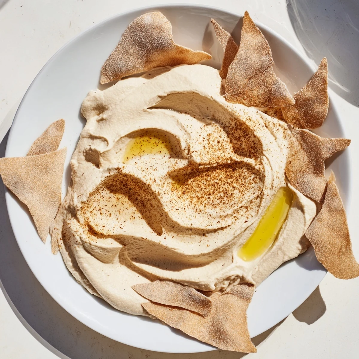 The hummus holds perfectly in the refrigerator for up to three days, and the chips stay crisp in an airtight container for the same stretch of time. The day you're serving, blend the hummus fresh if you can—it'll have a lighter, more luxurious texture than something that's been sitting. If you're short on time, shape the hummus an hour before guests arrive, cover it loosely with plastic wrap, and add the oil and garnish at the last moment for maximum freshness and shine.