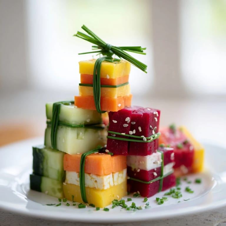 Save to Pinterest Festive and colorful veggie cubes stacked to resemble holiday gift boxes—a healthy, eye-catching snack perfect for parties and gatherings.