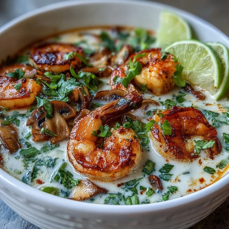 Save to Pinterest My neighbor brought a container of this soup to my door one rainy afternoon, still steaming, and I remember the smell hitting me before I even opened the lid—coconut, lime, that mysterious warmth of curry paste. She'd learned it from her mother in Bangkok, she said, and watching her make it later became one of those kitchen moments where you realize how quickly something so fragrant and complex can come together. The first spoonful was like tasting Thailand itself, creamy and bright and just spicy enough to make you sit up straighter. That's when I understood why she made it so often.