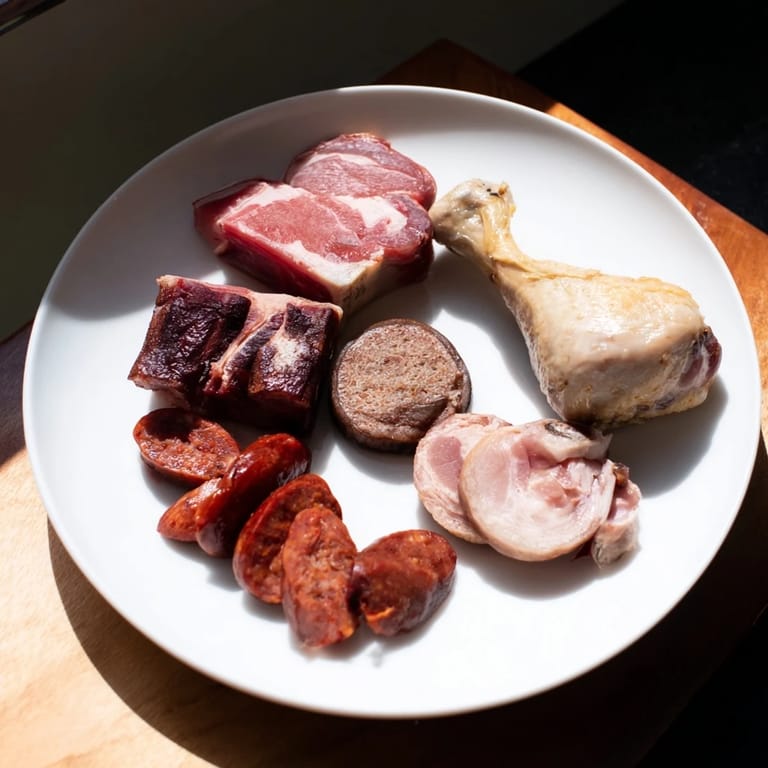 - Meats: 400 g beef shank, 300 g pork belly, 1 bone-in ham hock (approx. 300 g), 1 chorizo sausage (about 150 g) sliced, 1 morcilla (Spanish blood sausage, about 150 g) sliced, 1 chicken thigh (bone-in, skin-on)