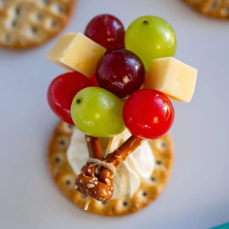 - Thread cherry tomatoes, grapes, cheddar cubes, and mozzarella balls onto each pretzel stick, alternating colors and shapes to mimic a vibrant hot air balloon.