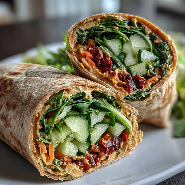 Save to Pinterest There's something about the smell of sun-dried tomatoes hitting your cutting board that makes you feel like you're cooking somewhere Mediterranean, even if you're in your regular kitchen on a Tuesday afternoon. I stumbled onto this wrap combination when I had a container of homemade hummus sitting in the fridge and a sudden craving for something that felt both nourishing and exciting. The first time I layered everything together, I was surprised by how the creamy, tangy hummus played against the bright crunch of fresh vegetables, creating something that didn't feel like "healthy food" but rather just genuinely delicious. These wraps have become my go-to when I need lunch to feel effortless but still feel special.