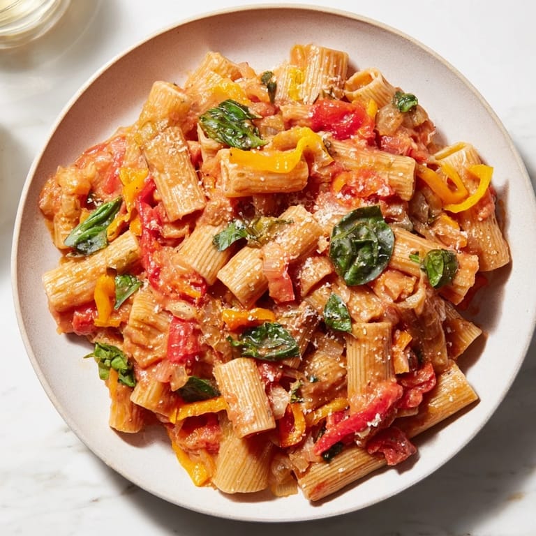 Save to Pinterest A festive, creamy pasta featuring a light tomato-vodka sauce, adorned with fresh spinach and roasted red peppers for a cheerful holiday presentation.